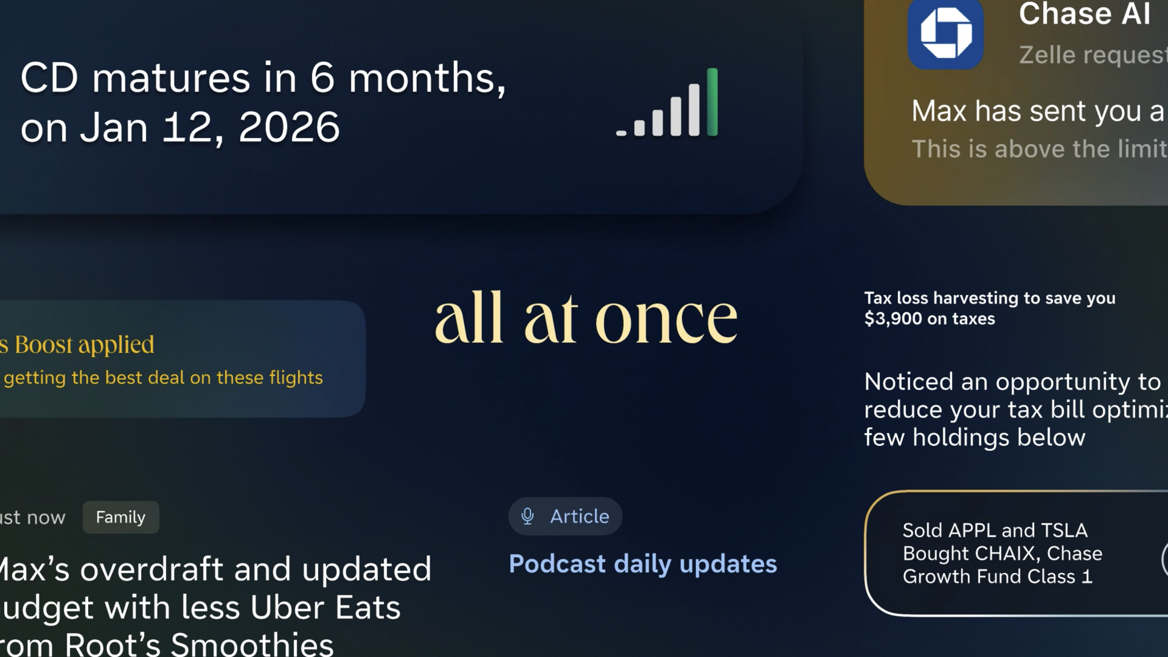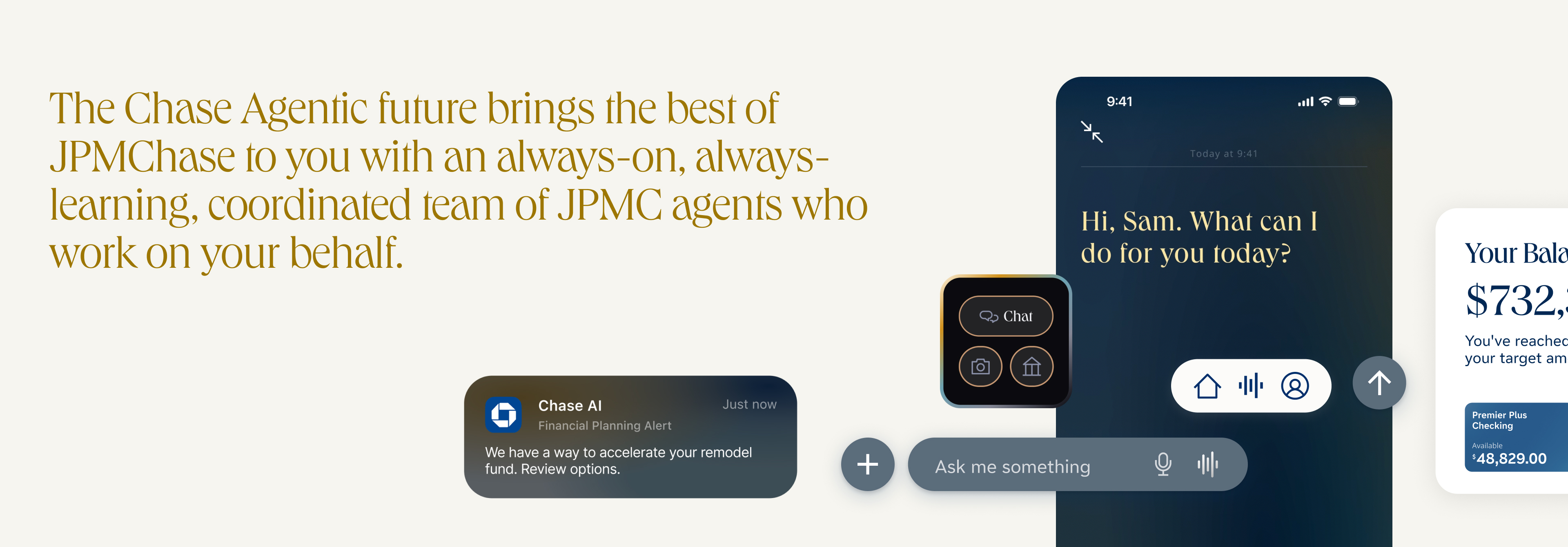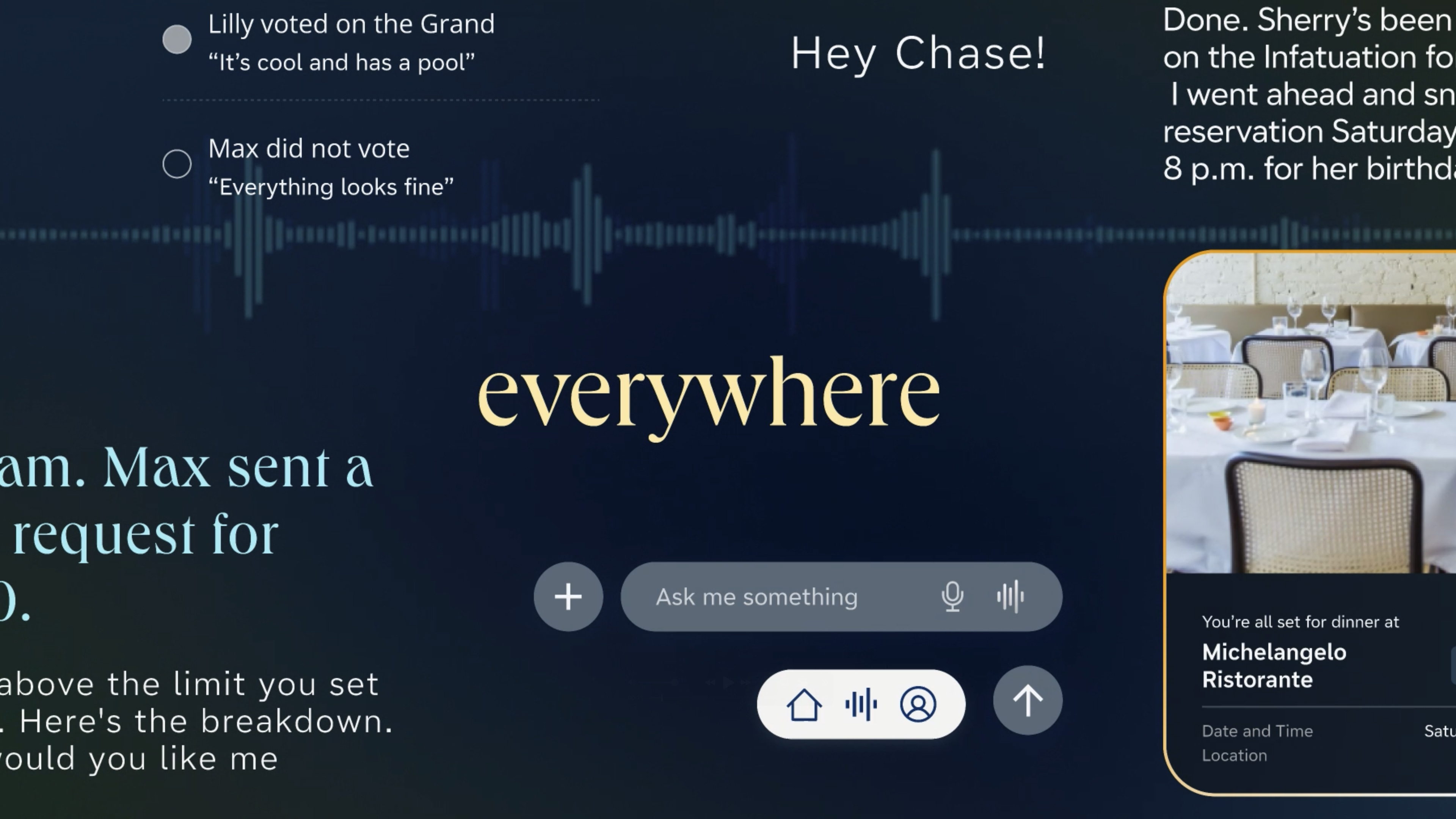 We envisioned a smarter, always-on Chase experience—powered by AI agents that anticipate user needs and act seamlessly on their behalf. Through ambient, multimodal, and contextual interactions, Chase empowers users to reach their financial goals with clarity, confidence, and a true sense of partnership.Key Goals