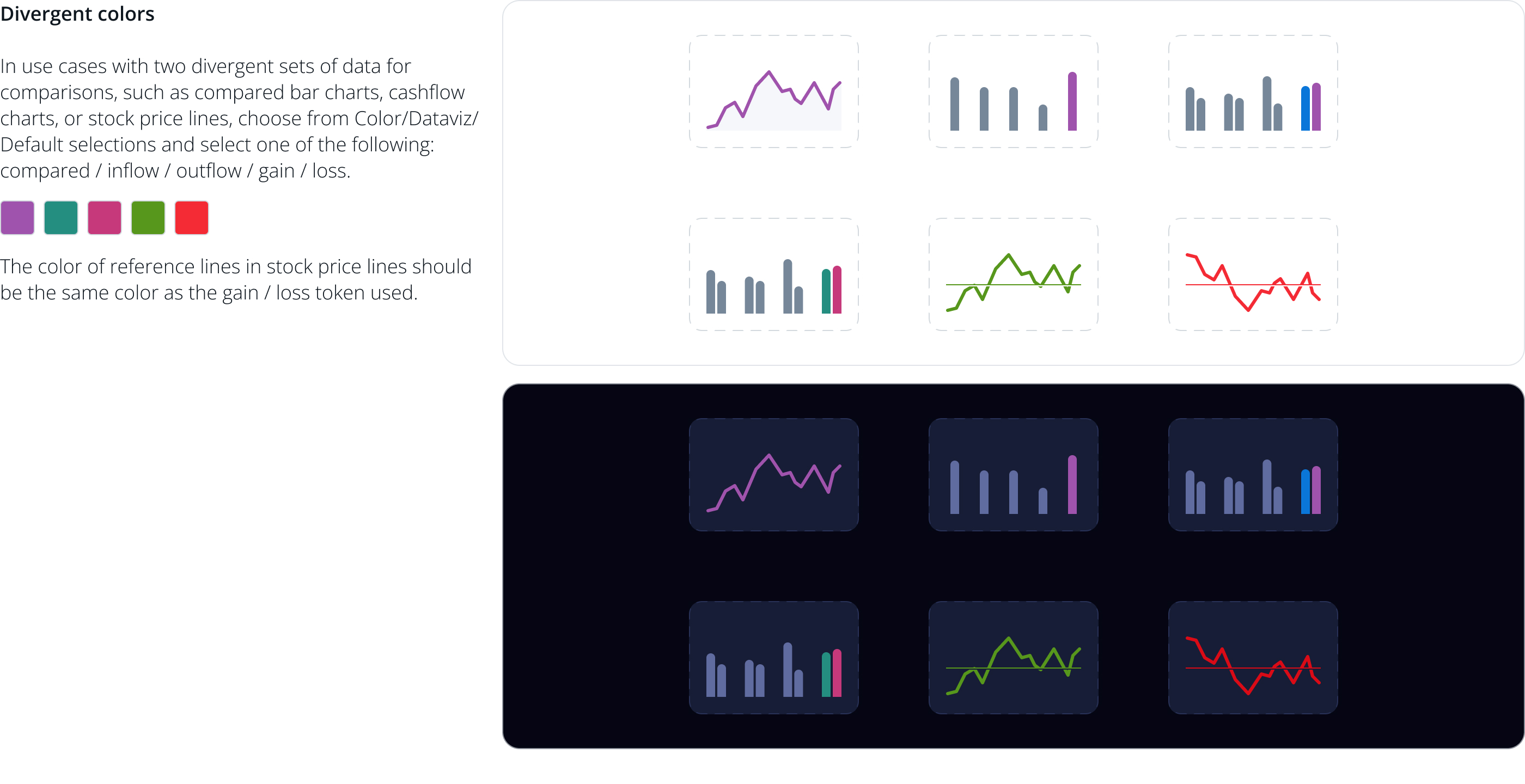 Color usage in skim charts is established from on MDS semantic color tokens - Colors/Dataviz - to reflect the most crucial number from the full chart experience.